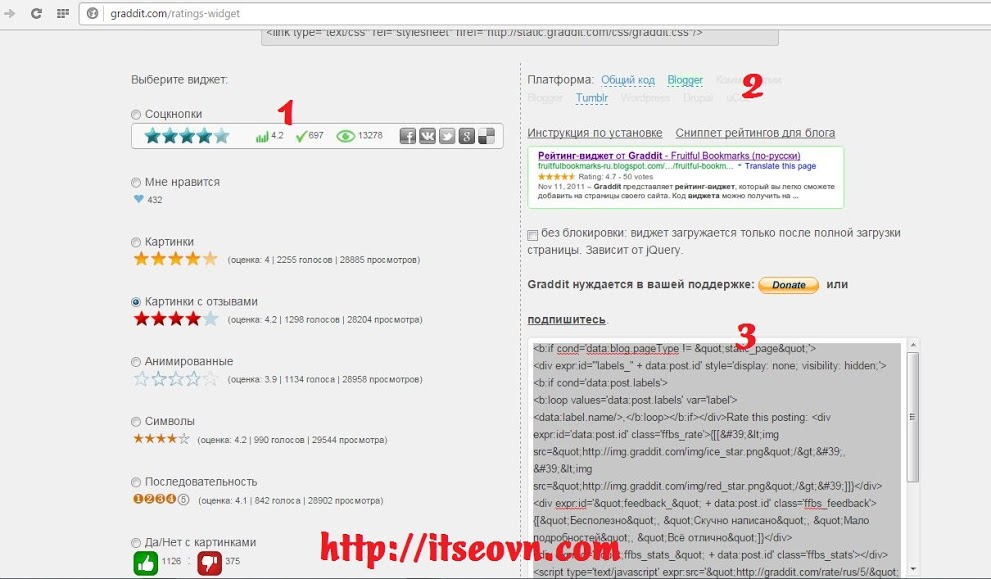 Có nhiều anh em làm site của mình bằng mã nguồn blogger làm site chính và muốn thể hiện độ chuyên nghiệp của cho site bằng việc thêm tính năng đánh giá cho điểm 5 sao, 4 sao, 3 sao,..... Mình xin mạn phép chia sẻ với các bạn thủ thuật cách chèn tính năng này cho site làm bằng mã nguồn blogspot nhé. Bạn nào biết rồi thì thôi nhé.Bước 1 : Truy cập vào địa chỉ http://graddit.com/ratings-widgetBước 2 : Chọn như hình